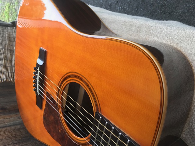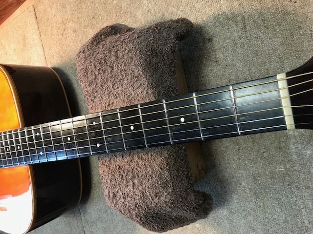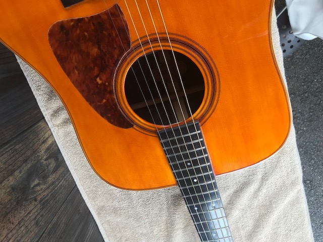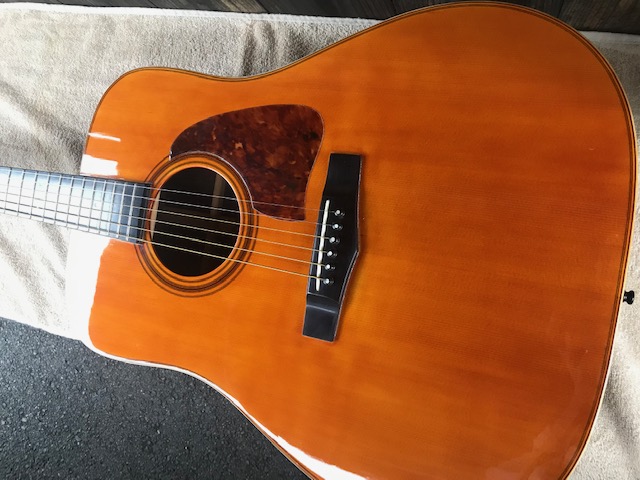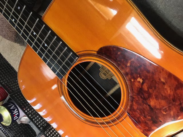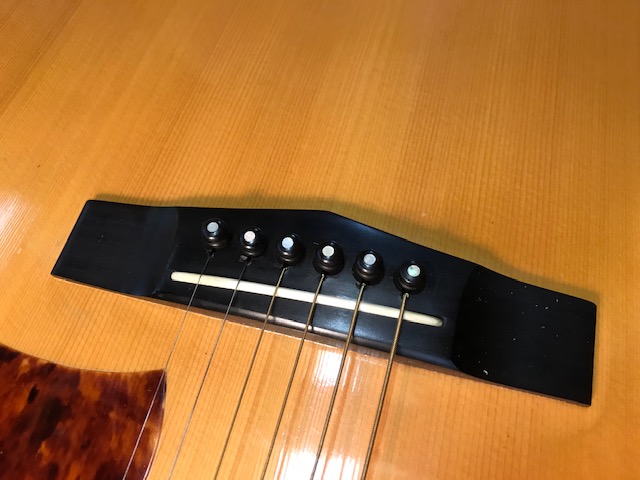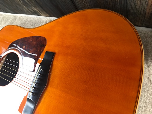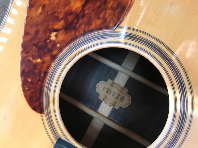 ピックガードの形状が特徴のタマギターです。このギターもジャパンビンテージギターの代表格ですが、今回はブリッジ剥がれ補修、サウンドホール周り・バックのキズ補修を実施します。