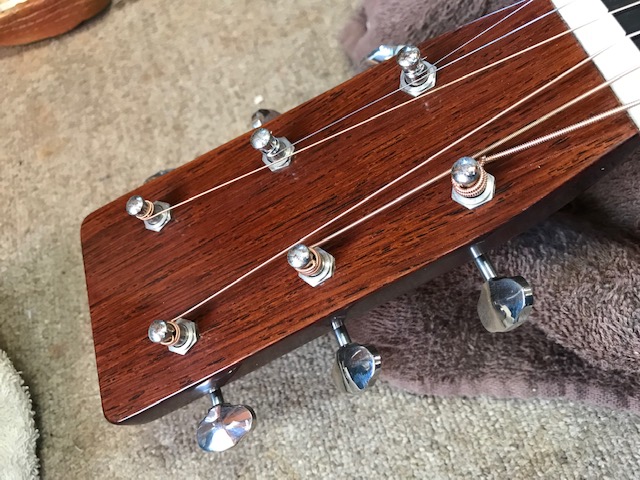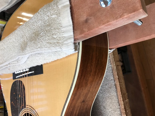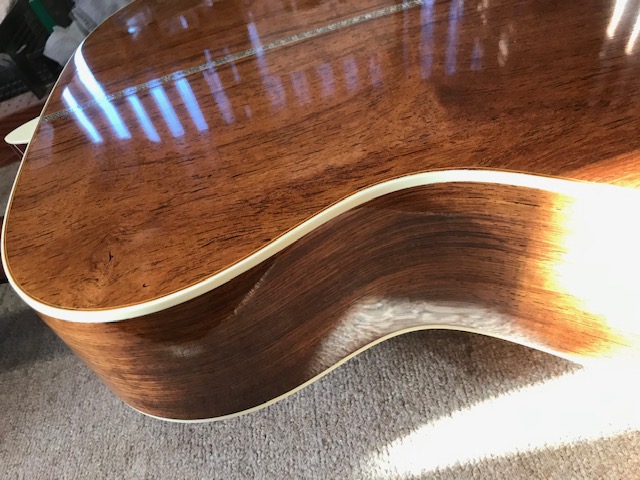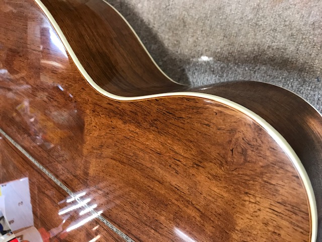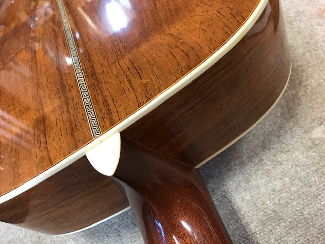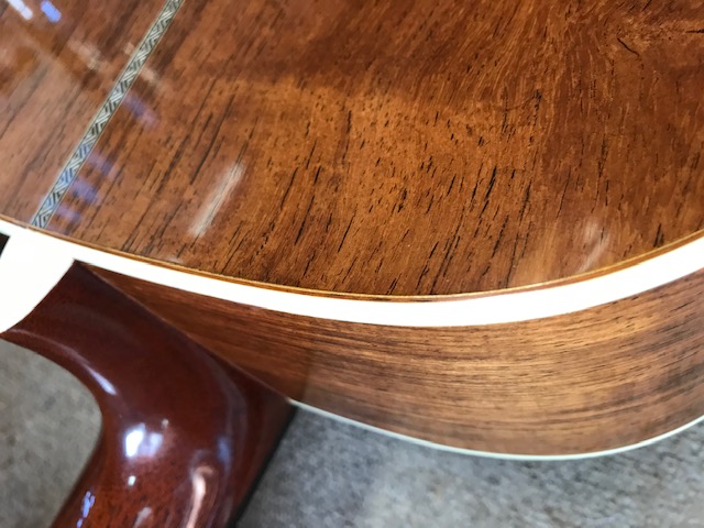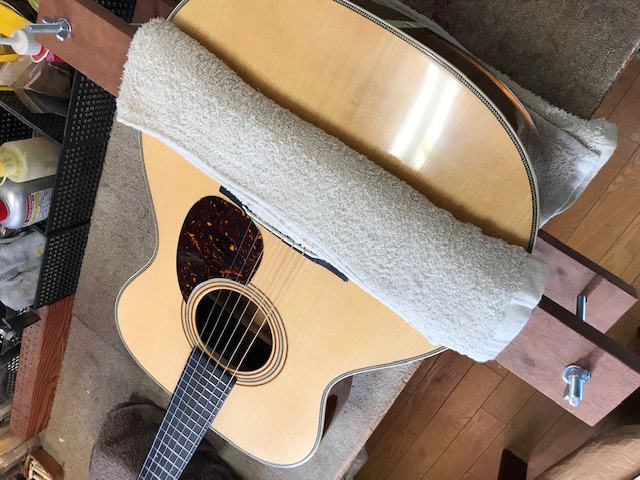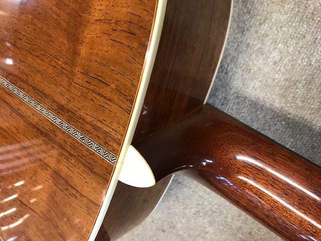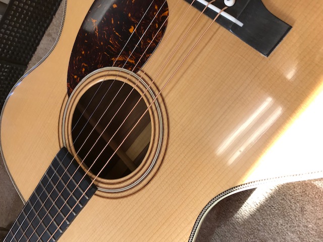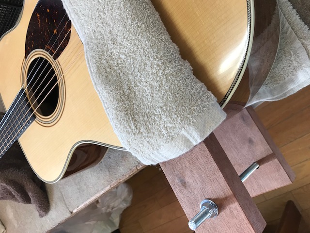 新品のマーチンOM28オーセンティックです。ビンテージ仕様ですので雰囲気がすごく良いです。サウンドも既にこなれていて弾きやすさも最高です。今回はトップ膨らみ補修とサドル交換を実施します。