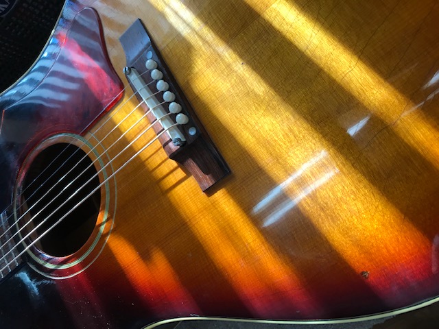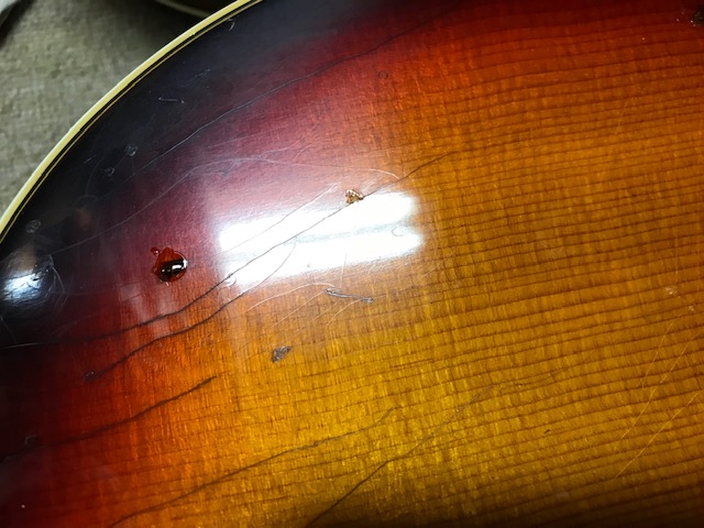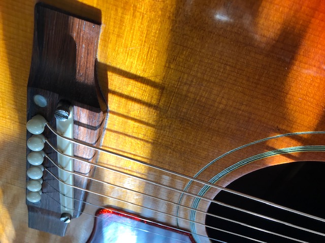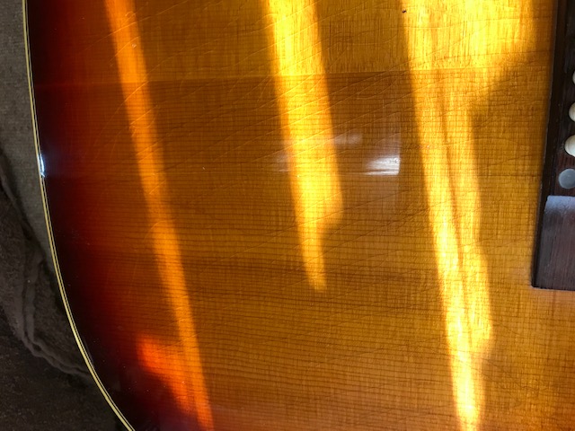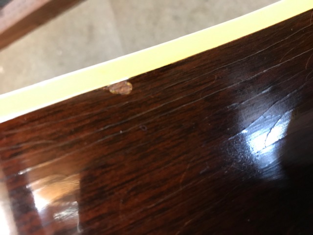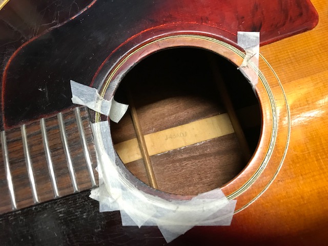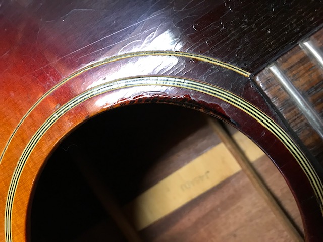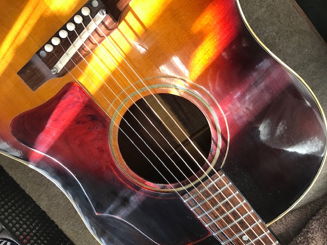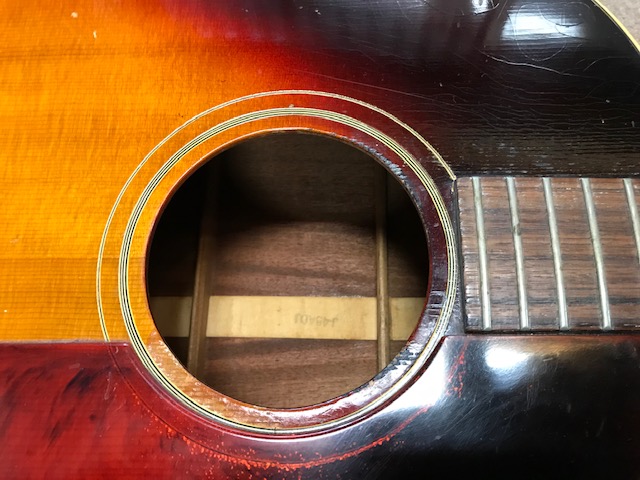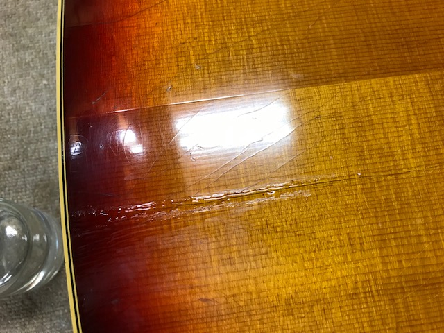 1967年製の古いギブソンギターでビンテージの風格があるギターですが、今回はトップひび割れ補修、サイドのキズ補修、全体クリーニングを実施します。