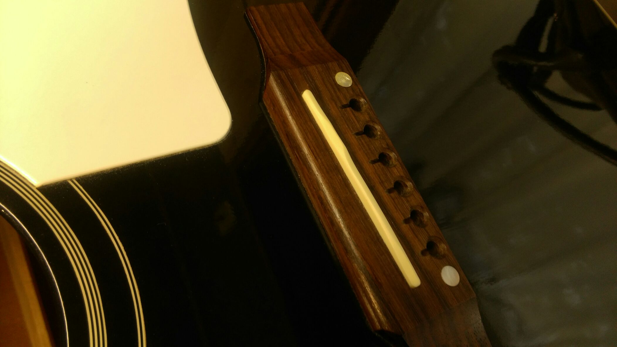 Gibson J-45 Ebony Black サドル削り出し 投稿日: 2015年9月11日2017年6月28日 投稿者: WoodyBlues こんにちは。リペアスタッフの金子です。 Gibson J-45のサドル作成ですがオクターブポイントの削り出しが完了しました。 その後は金やすりのキズをサンドペーパーやスチールウールで消し、 コンパウンドで磨き上げます。