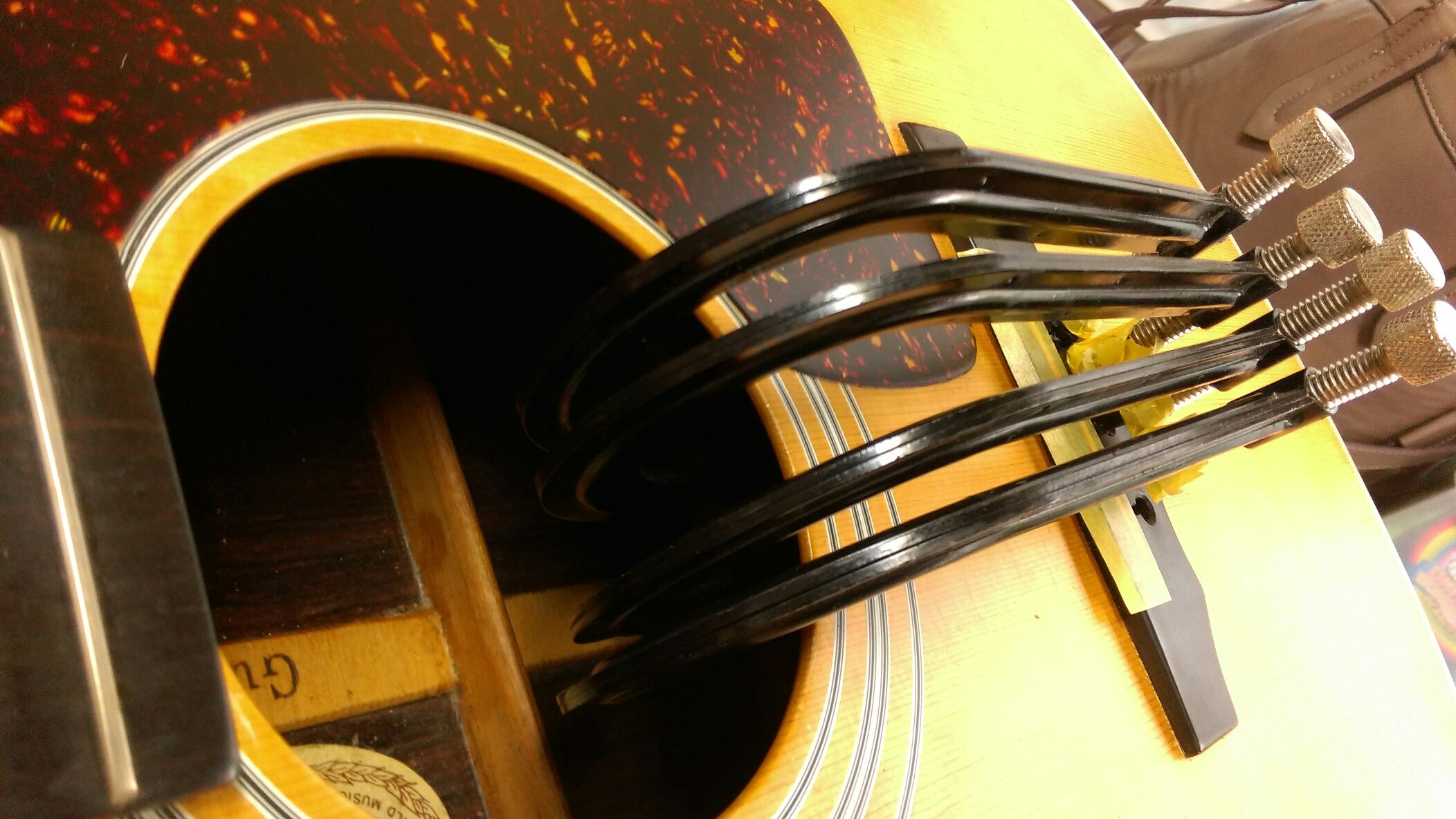 Guild GF ピン穴補修 投稿日: 2015年9月18日2017年7月6日 投稿者: WoodyBlues こんにちは。リペアスタッフの金子です。 引き続きGuild GFのブリッジ補修です。 2~5弦のブリッジピン穴に直径5mmのエボニー丸棒を埋め込みました。 硬化後、はみ出た部分を削り取っていきます。