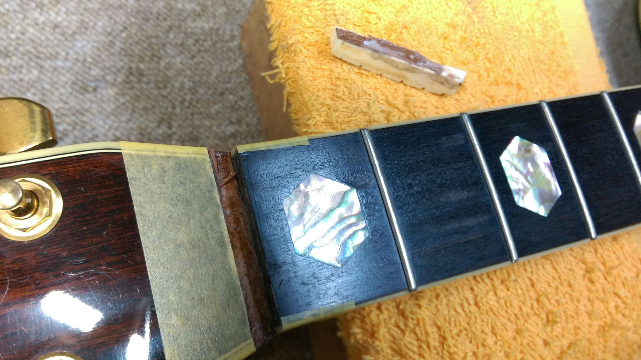 元のナットを取り外しました。ナットの底面にはマホガニー材のシムが取り付けられていました。