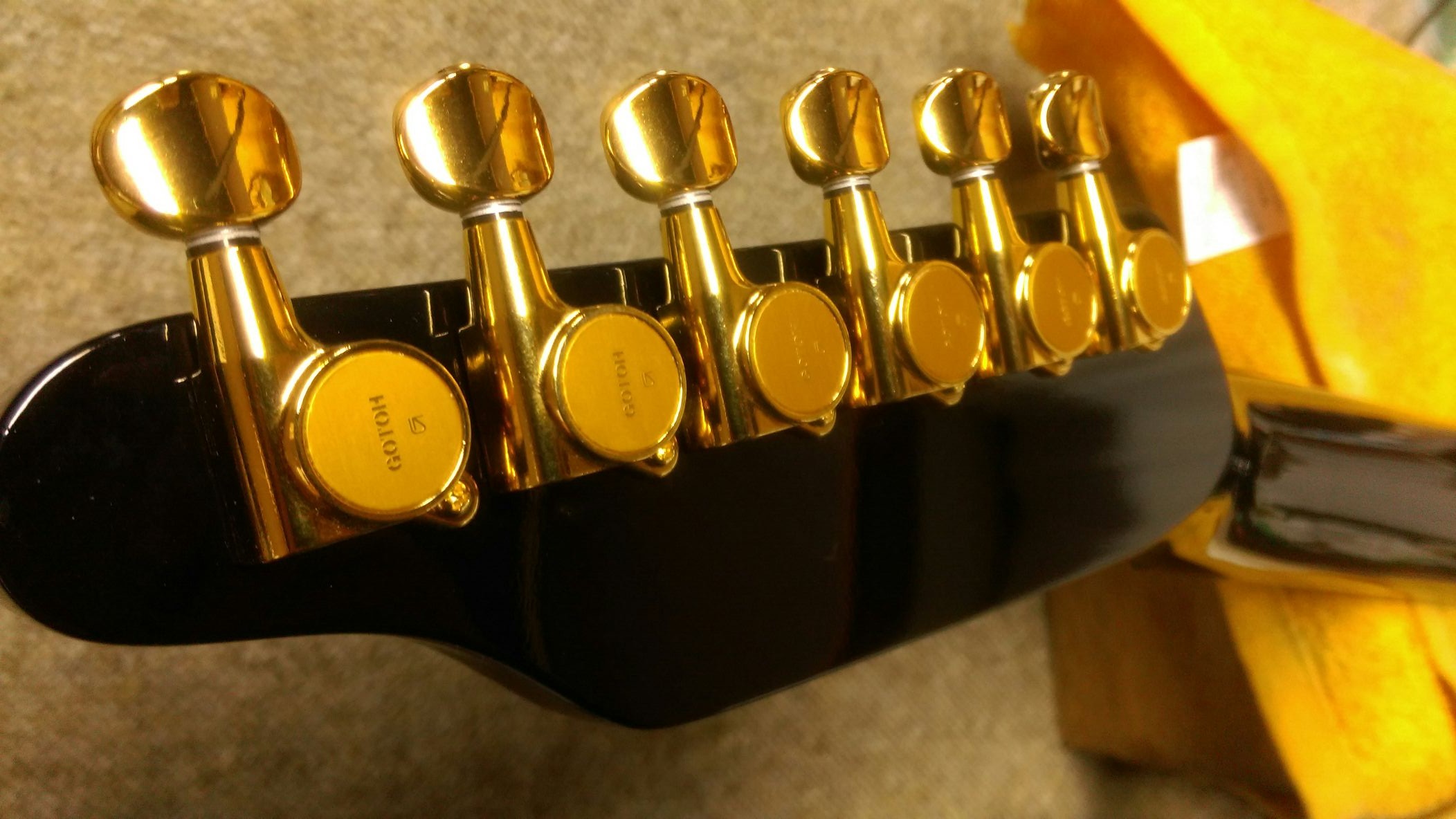 Takamine PT-106-6 ペグ交換 投稿日: 2015年12月1日 投稿者: WoodyBlues こんにちは。リペアスタッフの金子です。 Takamine PT-106-6ですが純正ペグからゴトーのマグナムロックへの交換を行いました。 マグナムロックへ変更することによって、よりチューニングの安定が見込めます。 黒→ゴールドになったことで見た目も華やかですね! 純正ペグと同サイズのためヘッドへの加工無しで取り付けできました。