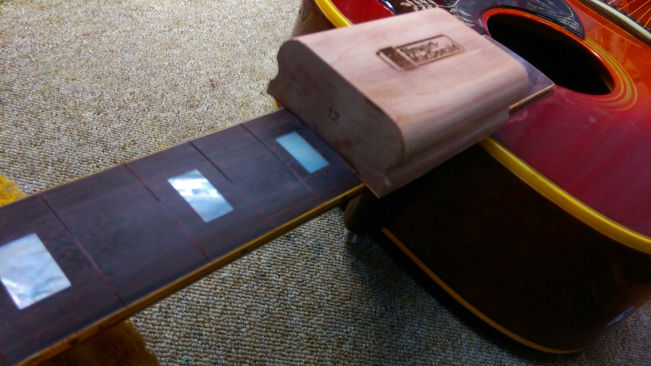 Gibson HUMMINGBIRD、Takamine PT-106-6 投稿日: 2015年12月8日2017年6月28日 投稿者: WoodyBlues こんにちは。リペアスタッフの金子です。 Gibson HUMMINGBIRDですが指板のねじれが大方修正できましたので、目の細かいサンドペーパーでサンディング後、フレット打ちに入ります。 Takamine PT-106-6はウレタンクリアの吹き付けを再度行いました。乾燥を待って、表面の磨きに入ります。