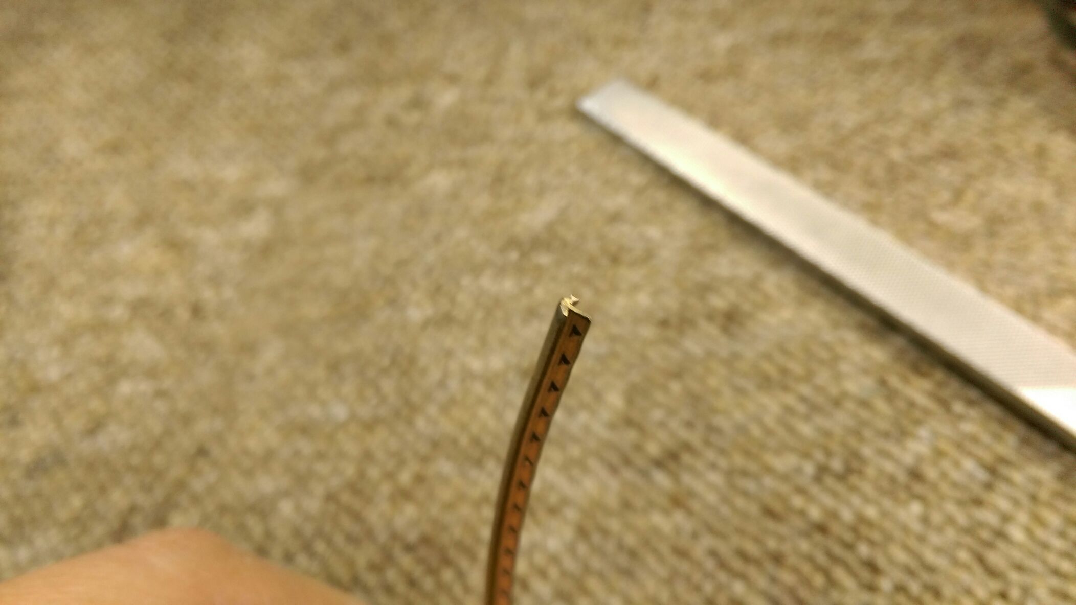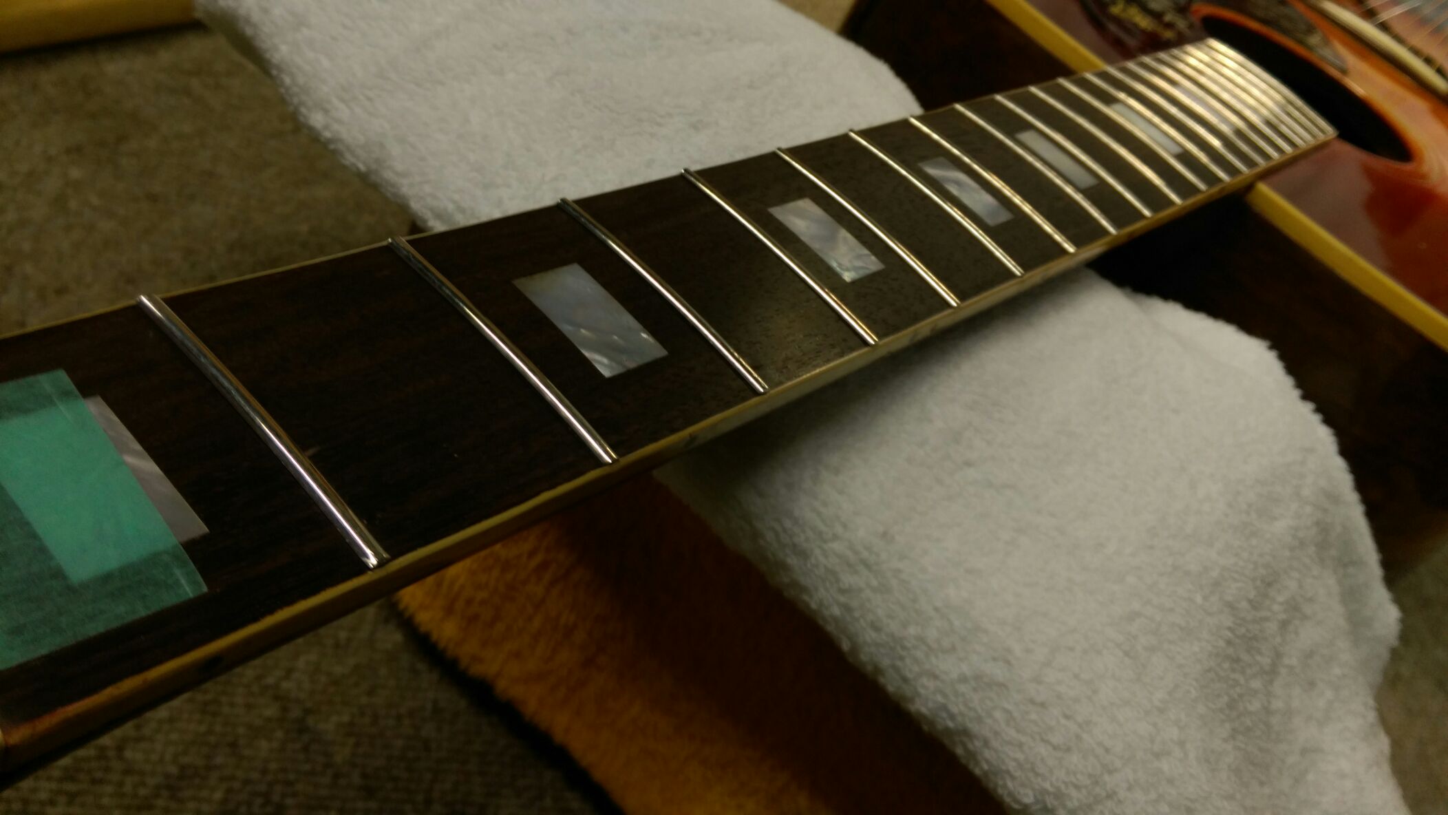 GIBSON HUMMINGBIRD フレット打ち続き 投稿日: 2015年12月24日2017年6月28日 投稿者: WoodyBlues こんにちは。リペアスタッフの金子です。 引き続きGIBSON HUMMINGBIRD のフレット打ちです。指板から飛び出さないよう一本一本指板の幅分の長さに削ってから打ちこみます。 すべて打ちこみ終わりました。 細かい浮き等を確認して問題なければサイド処理に入ります。