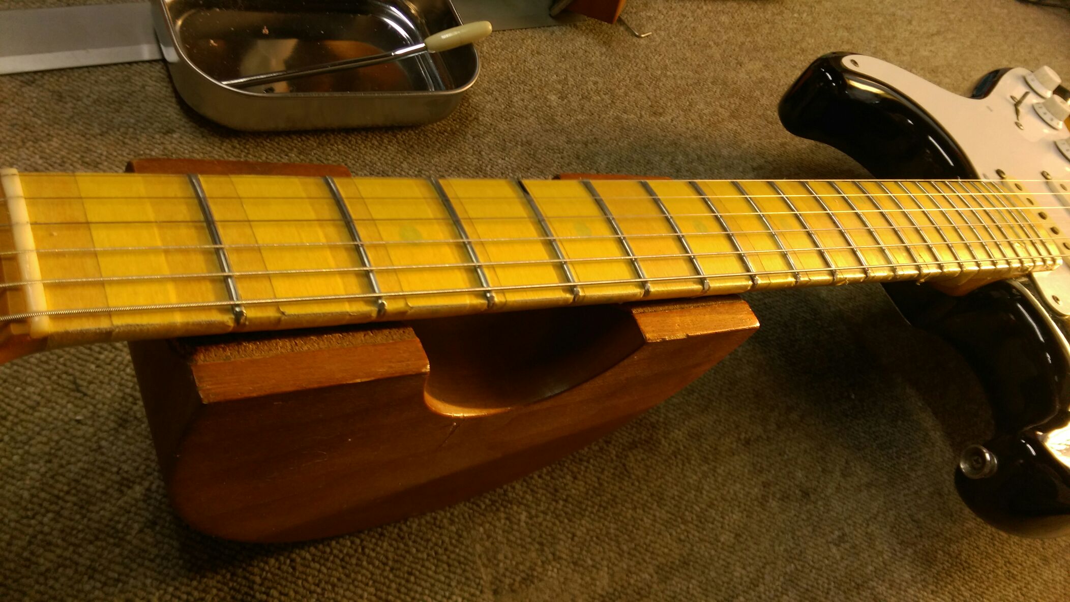 Seymour Duncan ストラトタイプ 投稿日: 2016年2月3日2016年2月3日 投稿者: WoodyBlues こんにちは。リペアスタッフの金子です。 今回、珍しくエレキのリペアも行います。 Seymour Duncanのストラトタイプです。 フレット打ち、ナット交換を行っていきます。 まずはフレットを打ちを行い、サイドの処理後、一度弦を張ってビビるポイントを確認しフレットにマーキングします。