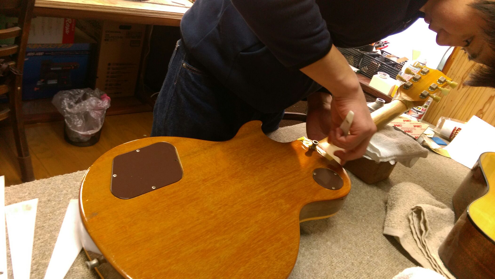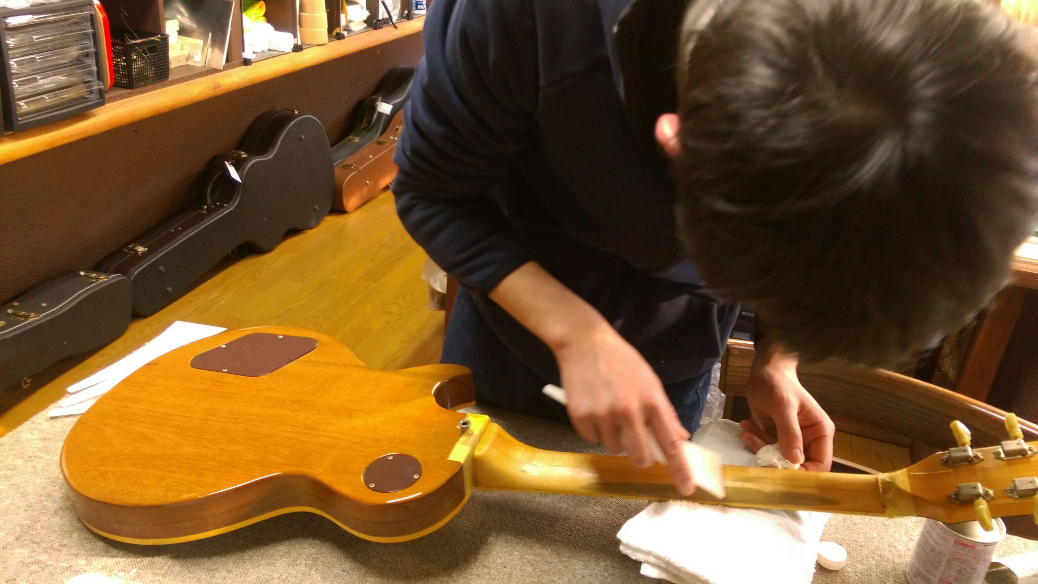インターンシップ 投稿日: 2016年2月8日2017年6月28日 投稿者: WoodyBlues こんにちは。リペアスタッフの金子です。 本日より3日間の予定で、地元高校の学生さんが当工房へインターンシップに来ています! 最初はリペアの概要等の説明し、その後は早速作業! Gibson レスポールデラックスのグリップ部分の塗装剥離を行ってくれています。