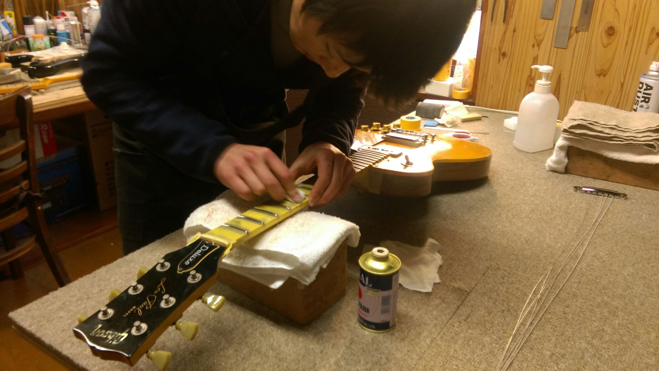 インターンシップ 最終日 投稿日: 2016年2月10日 投稿者: WoodyBlues こんにちは。リペアスタッフの金子です。 学生さんのインターンシップは今日が最終日。 今日はナット作成体験、素地調整、フレット磨きを行って頂きました。 高校卒業後は、ギタークラフト&リペアが学べる専門学校への進学を希望されているとのことです。今後の活躍が楽しみですね!