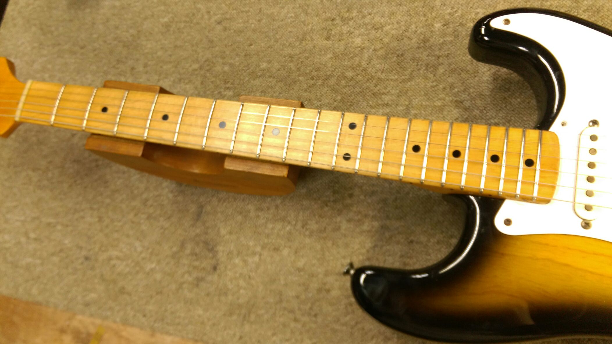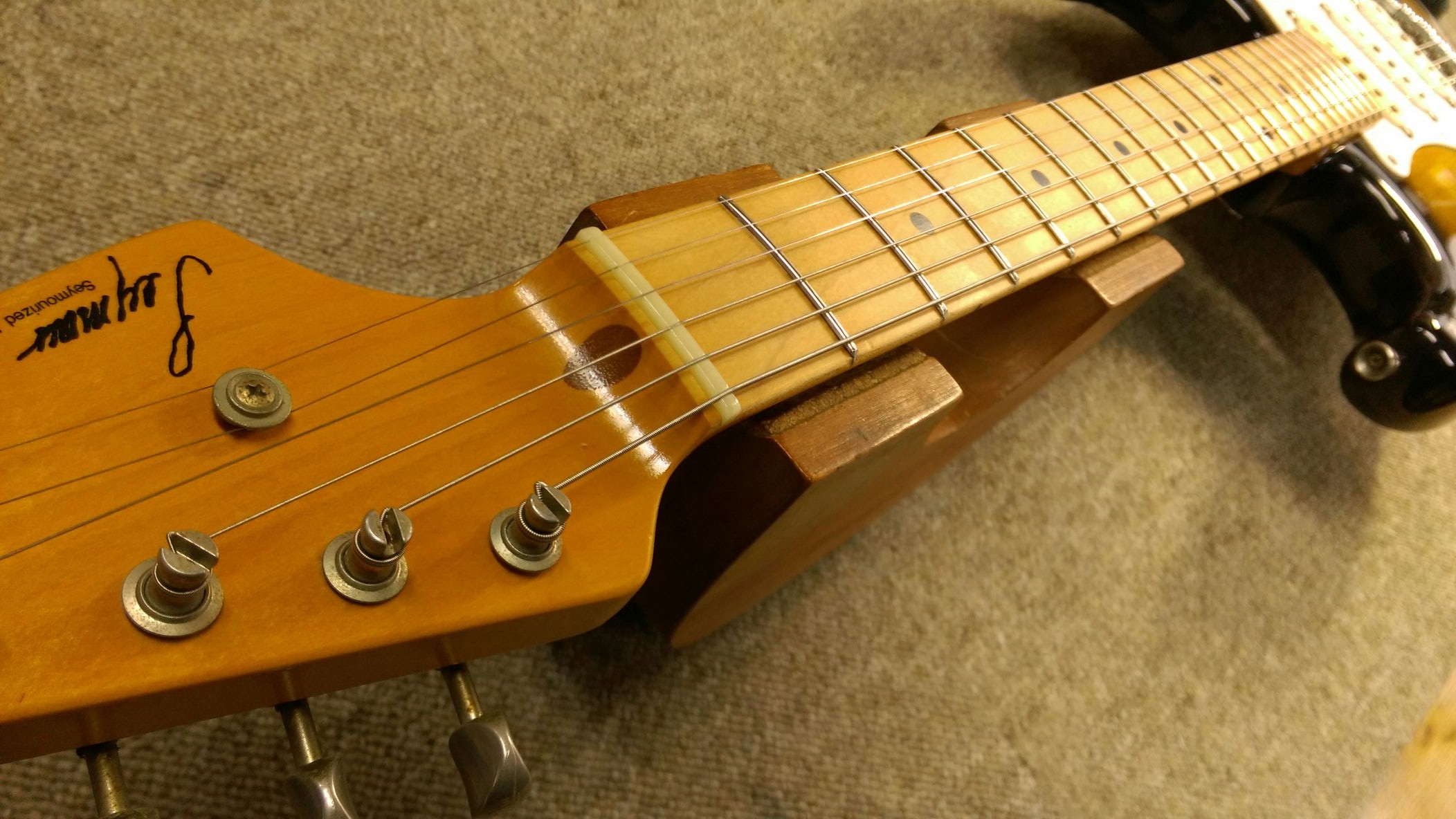 Seymour Duncan ストラトタイプ ネック周り 投稿日: 2016年2月23日2016年2月24日 投稿者: WoodyBlues こんにちは。リペアスタッフの金子です。 Seymour Duncanのストラトタイプはフレット磨き、指板表面の仕上げを行ってネック周りの作業が完了です。 指板はオイル仕上げにしました。