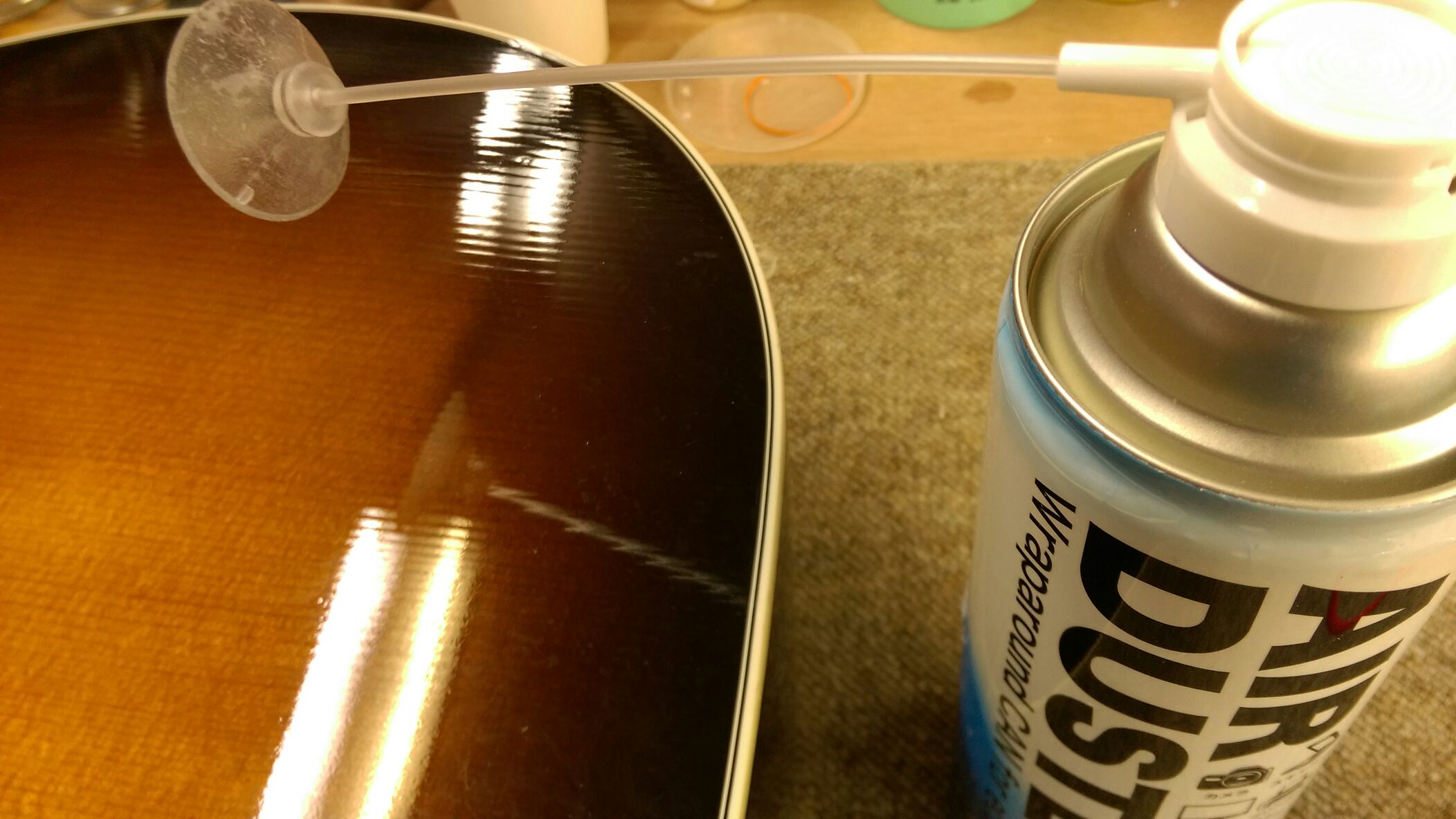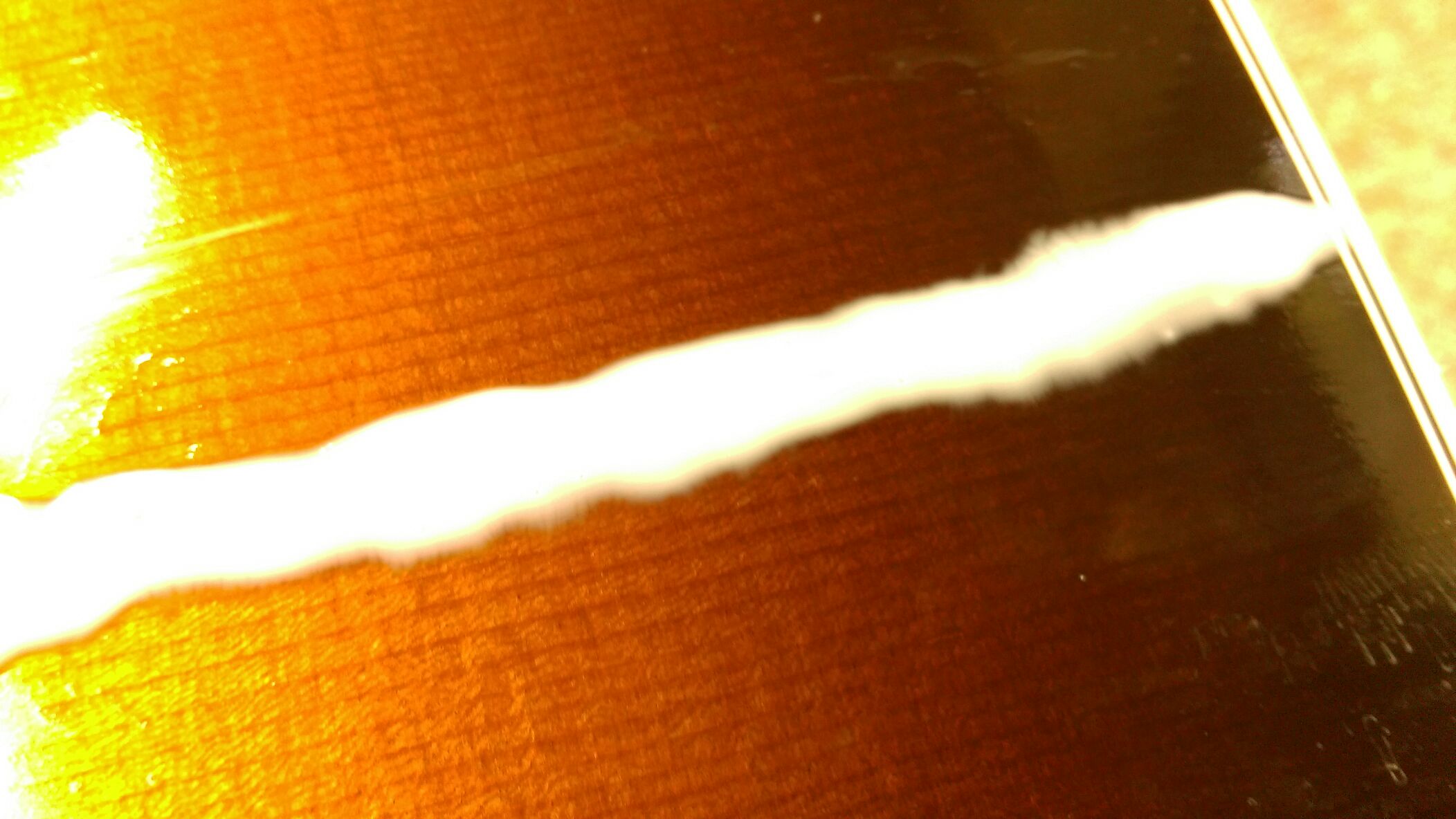 Gibson J-45 クラック補修 投稿日: 2016年4月20日2017年6月28日 投稿者: WoodyBlues こんにちは。リペアスタッフの金子です。 Gibson J-45のトップ板クラック補修に入ります。まず、割れの表面に薄めたタイトボンドを流し込みます。 流し込んだ後、吸盤を付けたエアダスターで空気を送ると、細部までタイトボンドが行き渡ります。その後、はみ出たタイトボンドはきれいに拭き取ります。 タイトボンドの乾燥を待つ間に補強用のクリートを作成しておきます。
