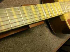 その後は弦を張ってビビりをチェックした後、フレットのすり合わせを行います。すり板を使ってフレットの頂点を揃えます。