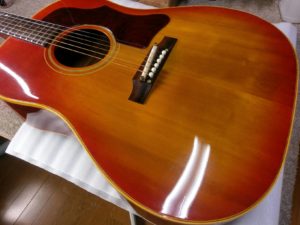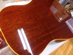 Gibson J-45 塗装磨き 投稿日: 2017年2月24日2017年6月28日 投稿者: WoodyBlues こんにちは。リペアスタッフの金子です。 1964年製Gibson J-45の塗装磨きをご依頼頂きました。 バックやサイドにくすみがみられます。 ビンテージギターで塗膜が薄いため、軽くバフ掛けした後は手磨きで仕上げました。
