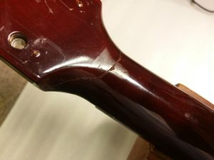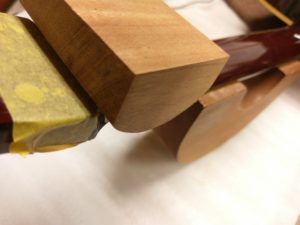 Gibson J-45 ネック補強作業 投稿日: 2017年6月15日2017年6月28日 投稿者: WoodyBlues こんにちは。リペアスタッフの金子です。 Gibson J-45 のネック折れリペア続きです。 接着完了後は、補強材を接着するためにベルトサンダーで患部を丸く削り取ります。 マホガニーの当て木を準備し、ネック側にピッタリ合うよう調整します。