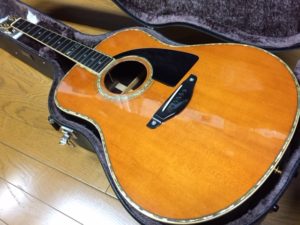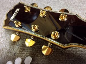 YAMAHA LL-55DEXはヘッド塗装に続いてペグつまみ交換とピックガード貼り付けを行います。