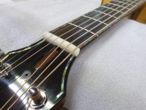 BSG J16 SCFはフレット修正に続いてナット交換です。元のナットは弦溝が深くなっており、開放弦でビビリが発生するため交換することとなりました。