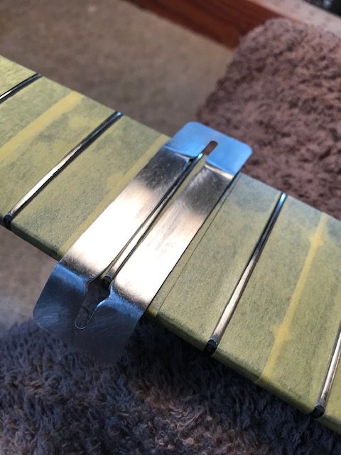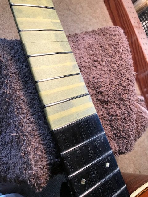 Martin 00028EC (フレットすり合わせ) 投稿日: 2021年5月10日2021年5月10日 投稿者: WoodyBlues トップ膨らみ補修、ネックアイロンでのネック反り補修を終え、次はフレット調整となります。一部ビビりがある部分を中心にフレットすり合わせを行います。