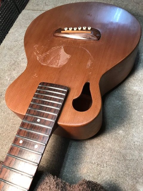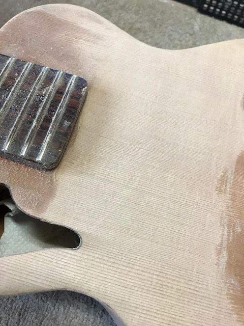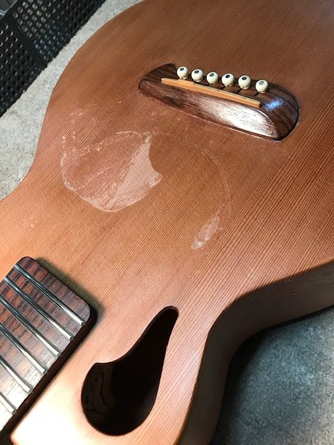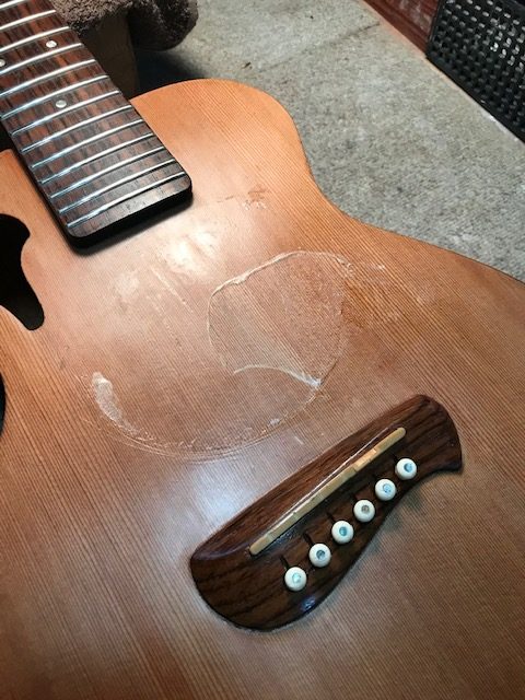 Tacoma P1 (トップ再塗装)ピックガードを剥がした跡が残っていて、塗装も剥げていますので、トップ全体の再塗装となります。一旦トップの塗装を全て取り、木地を整えてラッカー塗装を実施します。まずは塗装剥がしから取り掛かり、ピックガード跡のあたりをサンディングしました。跡は綺麗に無くなっています。