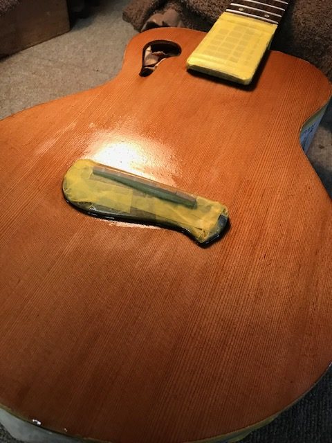 トップ全体のサンディングを行い、ウッドシーラー塗布です。ウッドシーラーは塗装の染み込みを押さえる役割がある、下塗り用の塗料です。乾燥が終わったら次は肉持ちの良い「サンディングシーラー」塗布を行います。これは中塗りと言われる工程で、比較的短時間に厚い塗膜が形成できます。