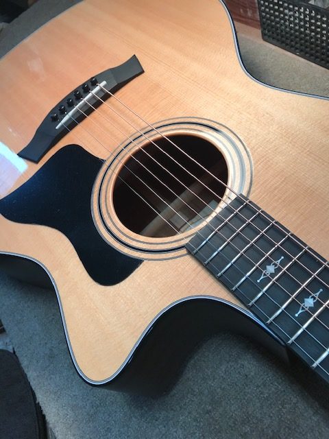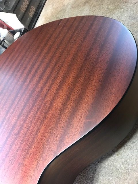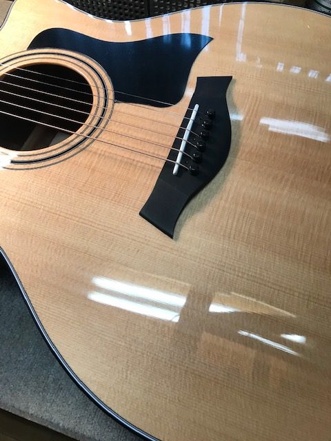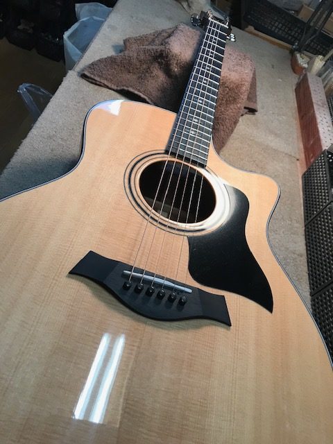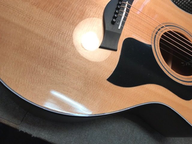指板のバインディングが特徴的な、殆んど新品状態のテイラーギターです。全体的に半艶の塗装がされていますが、今回はトップのバインディングについた小さいキズを取り除きます。基本的にはサンディングのみで処置できると考えますが、鏡面仕上げでなく、現状の半艶状態に合わせる必要がありますが、これはなかなか難易度が高いです。#2000~#3000あたりで艶の状態をコントロールします。